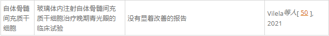 迄今為止,在臨床試驗中沒(méi)有描述任何顯著(zhù)影響。在晚期青光眼患者中,玻璃體內注射自體BMSCs并未引起視力或視野的明顯改善。