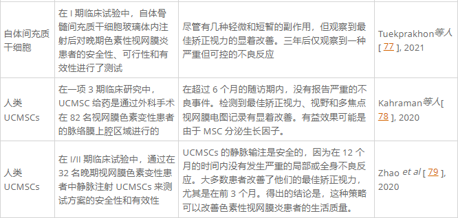 在I/II期臨床試驗中,對32名晚期RP患者進(jìn)行了臍帶間充質(zhì)干細胞靜脈內給藥,以評估安全性和有效性方案。單劑量注射后,對所有受試者進(jìn)行為期12個(gè)月的隨訪(fǎng)。結果表明,臍帶間充質(zhì)干細胞的靜脈輸注是安全的,因為沒(méi)有發(fā)生嚴重的局部或全身不良反應。大多數患者改善了他們的BCVA,尤其是在前3個(gè)月。結論是靜脈輸注臍帶間充質(zhì)干細胞可以改善晚期RP患者的生活質(zhì)量。