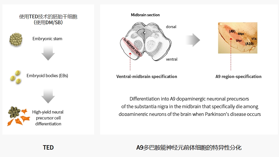 A9-DPC(也稱(chēng)為T(mén)ED-A9)是一種在研細胞療法,旨在替代帕金森病患者丟失的腹側中腦特異性多巴胺能神經(jīng)元。這些腹側中腦特異性多巴胺能細胞源自人胚胎干細胞(hESC),在嚴格的GMP條件下,僅使用小分子。A9-DPC代表了該領(lǐng)域的重大進(jìn)展,能夠提供源自hESC的高純度多巴胺能細胞。