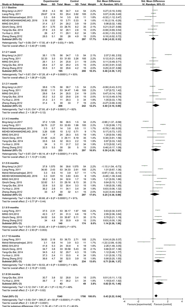 我們分析了ALB和INR水平,以研究干細胞療法對肝臟合成功能的影響。與對照組相比,干細胞治療后ALB 水平顯著(zhù)升高 (p<0.0001)。但應考慮ALB水平的異質(zhì)性(p<0.00001;I2=87%)。亞組分析顯示,干細胞治療后9、12、24個(gè)月ALB水平顯著(zhù)升高(圖2)。