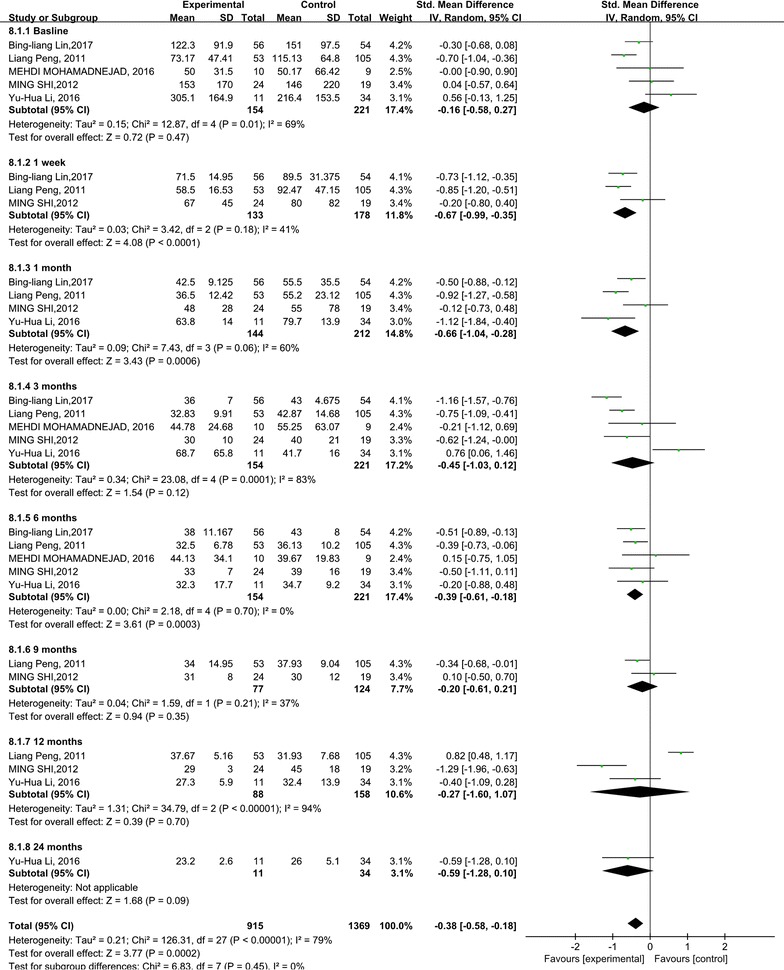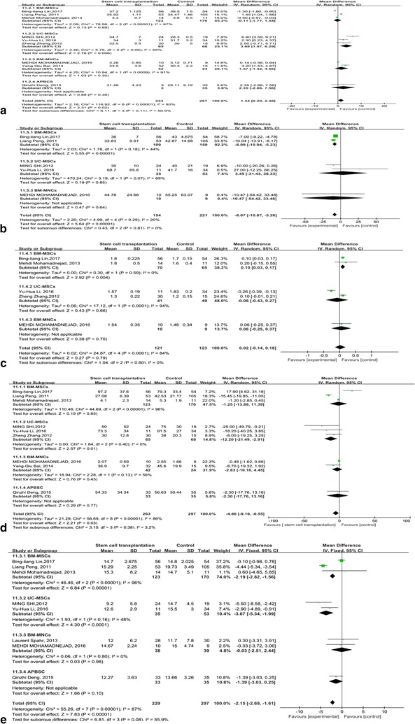 MELD評分主要用于評估終末期肝病的預后。我們觀(guān)察到干細胞治療組和對照組的MELD評分均有所下降。干細胞治療組和對照組之間存在顯著(zhù)差異 (p =0.008)(圖6)。此外,盡管進(jìn)行了亞組分析,但這些研究的異質(zhì)性很高 (I 2 : 62–100%)。但這也可以?xún)H通過(guò)一兩項研究來(lái)解釋。