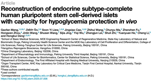 2025年8月8日,北京大學(xué)生命科學(xué)學(xué)院鄧宏魁團隊在國際頂級期刊《Cell Stem Cell》上發(fā)表了關(guān)于干細胞來(lái)源胰島功能重建的重大突破。[1]