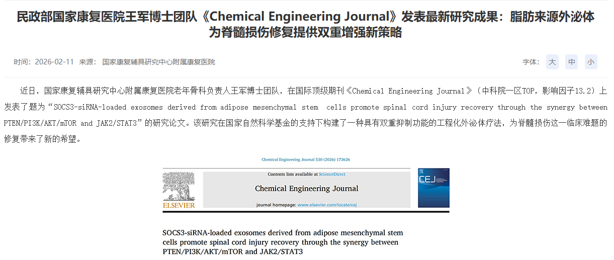 近期,民政部國家康復醫院王軍博士團隊在國際期刊《Chemical Engineering Journal》發(fā)表研究成果,利用工程化脂肪干細胞外泌體為脊髓損傷修復提供“雙重增強”新策略。該研究通過(guò)裝載SOCS3-siRNA的工程化外泌體,同時(shí)抑制PTEN與SOCS3兩條關(guān)鍵通路,在神經(jīng)再生與抗炎方面展現協(xié)同效應,為這一臨床難題帶來(lái)全新解決方案。