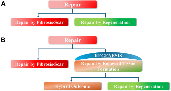 (B) 將再生納入經(jīng)典修復范式的精細框架。再生是指損傷后組織重新形成,涵蓋一系列結果,包括以部分組織更新伴纖維化為特征的混合愈合反應,以及以完全結構和功能恢復且不伴纖維化為特征的完全再生。大多數基于干細胞的療法產(chǎn)生的是再生,而非純粹的纖維化或完全再生
