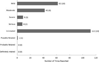 根據嚴重程度、嚴重性和與研究治療的關(guān)系分類(lèi)的AE。共報告了113起。