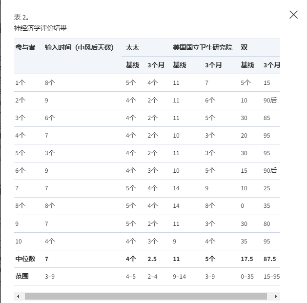 三個(gè)月后,所有參與者的mRS相對于基線(xiàn)(輸注時(shí)間)至少提高了一個(gè)等級,平均mRS為2.8±0.9(范圍 1-3分),表明結果有所改善。50%的受試者在mRS中表現出1級改善,40%改善 2級,10%(1名患者)改善 3級。NIHSS用于測量基線(xiàn)時(shí)和卒中后3個(gè)月因卒中引起的損傷,同樣證明了從輸注??時(shí)間(平均11.2±1.6;范圍9-14)到3個(gè)月評估(平均5.3±2.2;范圍3- 9),改善至少4分(平均5.9±1.4;范圍4–9)(表2)。