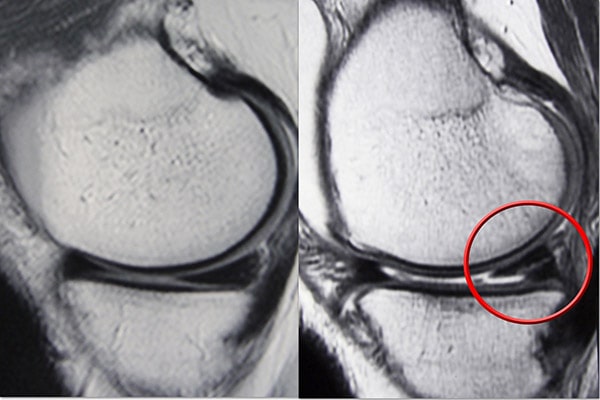 MRI 掃描顯示(左)正常的半月板和(右)撕裂的半月板。撕裂可以看作是穿過(guò)半月板黑色主體的白線(xiàn)