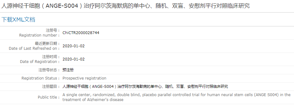 目前,在中國臨床試驗注冊中心有多項關(guān)于干細胞治療老年癡呆的項目注冊,例如《人源神經(jīng)干細胞(ANGE-S004)治療阿爾茨海默病的單中心、隨機、雙盲、安慰劑平行對照臨床研究》(ChiCTR2000028744)。