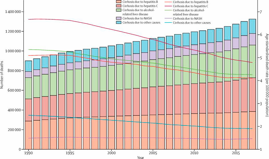 1990-2017 年全球肝硬化死亡統計數據。(來(lái)源)。