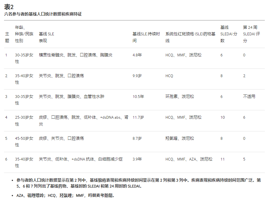 入組的6名患者均為女性,平均年齡38歲(范圍26-48歲)。兩名參與者是非裔美國人,一名是西班牙裔,三名是白人。平均病程為8.2年(范圍為3.9-11.7年)。一名患者在兒童時(shí)期發(fā)病?;€(xiàn)疾病特征見(jiàn)表2。盡管進(jìn)行了免疫抑制和生物治療,一名患者仍出現難治性橫貫性脊髓炎發(fā)作。一名患有腎臟疾病的患者在接受霉苯酯 (MMF) 治療后持續出現蛋白尿。除一名患者外,所有患者均服用羥氯喹和潑尼松。兩名患者使用MMF,一名患者使用硫唑嘌呤和MMF,一名患者使用環(huán)孢菌素。其中兩人因多次免疫抑制治療方案失敗而未服用免疫抑制劑。在整個(gè)試驗過(guò)程中,所有患者均繼續接受基線(xiàn)藥物治療。