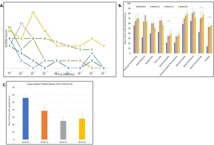 (C) 完成研究的五名患者在給定時(shí)間點(diǎn)的SF-36子量表分數??傮w健康狀況(p=0.02)、社會(huì )功能(p=0.02)和活力(p=0)顯著(zhù)提高。004)從第 12 周開(kāi)始一直持續到第52周。數據代表完成試驗至52周的5名患者的分數。SELENA SLEDAI,紅斑狼瘡中雌激素的安全性國家評估系統性紅斑狼瘡活動(dòng)指數。