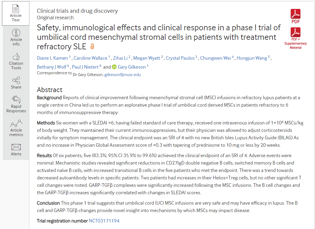 另外兩份關(guān)于狼瘡中MSC的報告是來(lái)自歐洲的病例報告,其中一份使用自體細胞,但沒(méi)有顯示任何改善。最近的一篇論文描述了對三名患有IV級狼瘡腎炎的女性進(jìn)行UC-MSC的同情使用。他們報告稱(chēng),兩名患者完全緩解,第三名患者部分緩解。