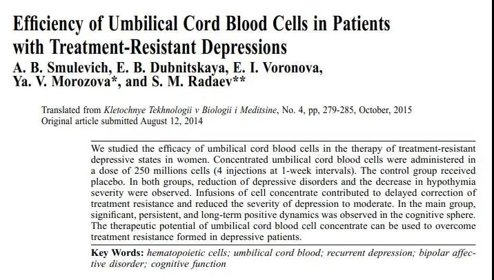 2014年,俄羅斯科學(xué)家使用臍帶血治療13名復發(fā)難治性抑郁癥患者,結果發(fā)現臍帶血有助于難治性抑郁癥的治療,特別是認知-情感亞量表的改善。