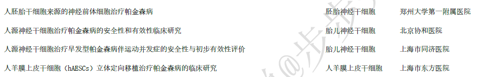 干細胞治療帕金森病目前也是一個(gè)不錯的選擇。國內也有機構正在積極開(kāi)展治療帕金森的干細胞療法臨床研究。在兩委局,干細胞臨床研究備案項目目前有4個(gè),細胞來(lái)源有3種(分別hESC衍生的神經(jīng)前體細胞,胎兒神經(jīng)干細胞和羊膜上皮干細胞),如下表: