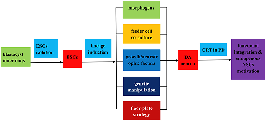 整個(gè)過(guò)程分為以下三個(gè)步驟: (1) 從胚泡內塊分離胚胎干細胞;(2) 通過(guò) (i) 應用形態(tài)發(fā)生素或可溶性生長(cháng)因子誘導ESC分化為DA神經(jīng)元;(ii) 飼養細胞共培養;(iii) 遺傳操作;(iv) 底板譜系誘導策略;(3) 通過(guò)功能整合和內源性NPCs動(dòng)機在PD治療中移植誘導的DA神經(jīng)元。