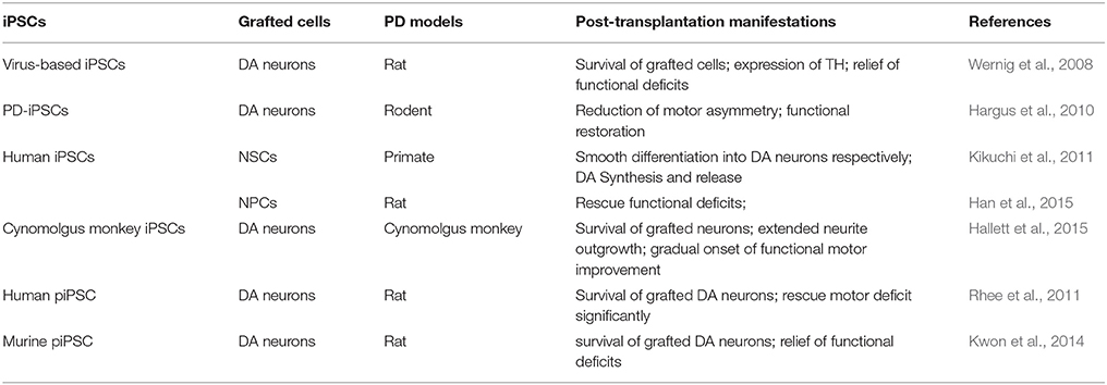 至于NSC,與ESC相比的一個(gè)潛在優(yōu)勢是,除了神經(jīng)譜系分化受限外,它們在移植后不易形成腫瘤和引起免疫排斥反應。然而,神經(jīng)干細胞顯示出一些缺點(diǎn),如有限的分化能力和來(lái)源、揮之不去的倫理問(wèn)題、帕金森癥狀的部分緩解。