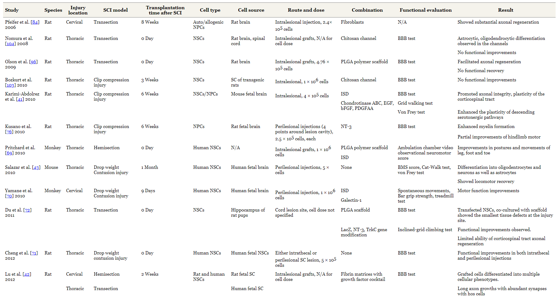 表1總結了使用NSC的實(shí)驗研究的特點(diǎn)。NSC治療已在SCI的各個(gè)階段進(jìn)行了測試:急性、亞急性和慢性。小鼠和大鼠是最常用的動(dòng)物。