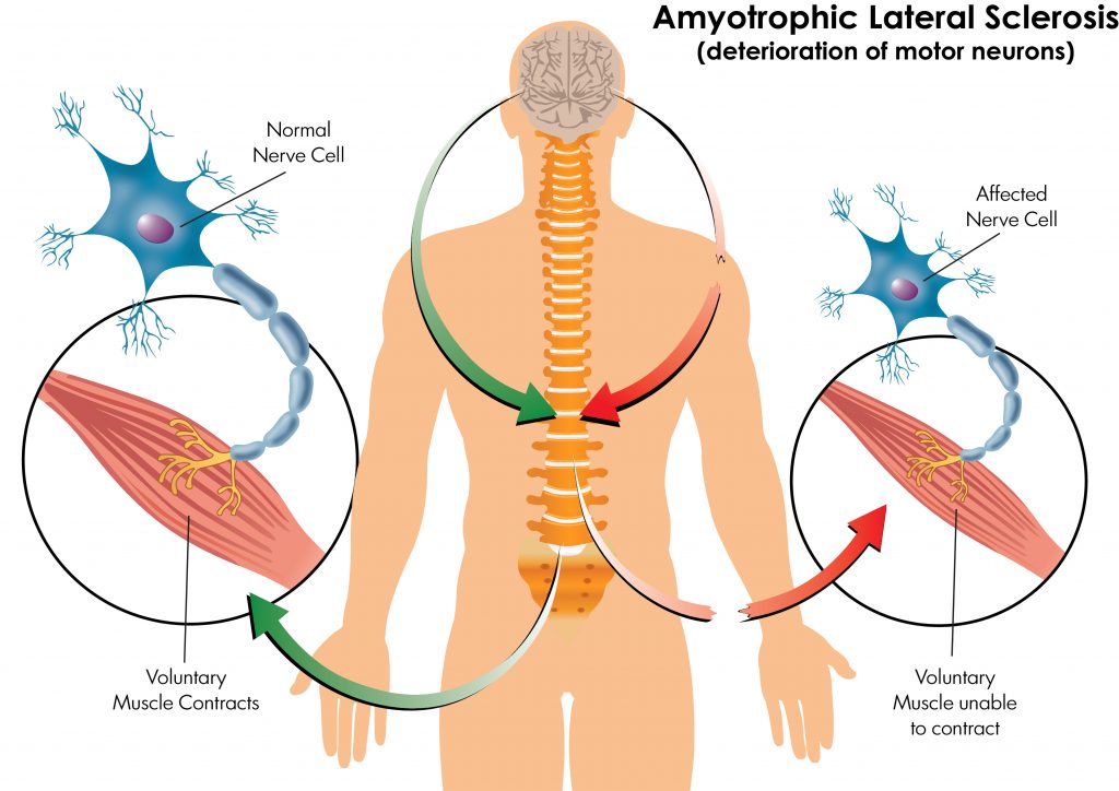 在 ALS 中,運動(dòng)神經(jīng)元退化然后死亡。這些神經(jīng)元不再能夠控制肌肉功能,患者會(huì )出現一系列虛弱的運動(dòng)癥狀。
