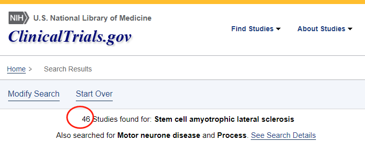 截止2022年11月,在美國國立衛生研究院的最大臨床試驗注冊庫clinicaltrials.gov網(wǎng)站上注冊的有關(guān)干細胞治療漸凍癥的臨床研究項目有46項。