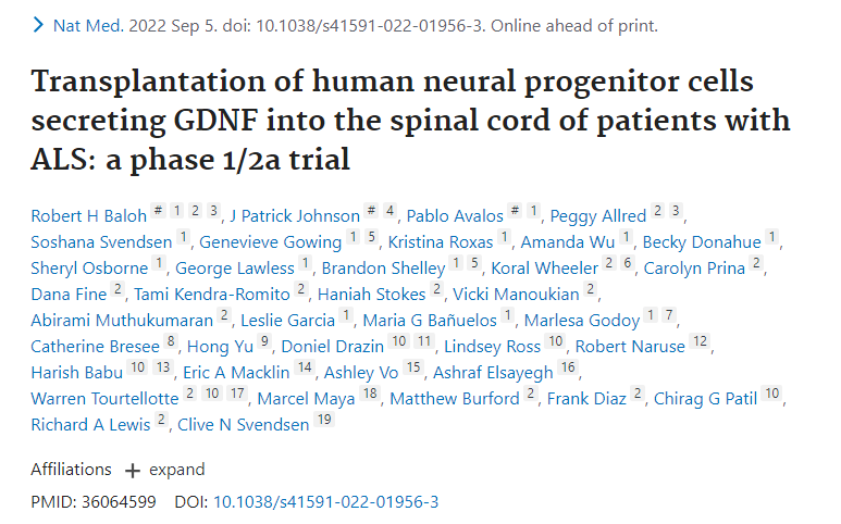 在1/2a期臨床研究(NCT02943850)中,CNS10-NPC-GDNF被移植到18名ALS參與者的腰椎中。主要安全性終點(diǎn)在1年時(shí)達到,與未治療腿相比,治療腿的移植對運動(dòng)功能沒(méi)有負面影響。對死于疾病進(jìn)展的13名參與者的組織分析顯示移植物存活和GDNF產(chǎn)生。