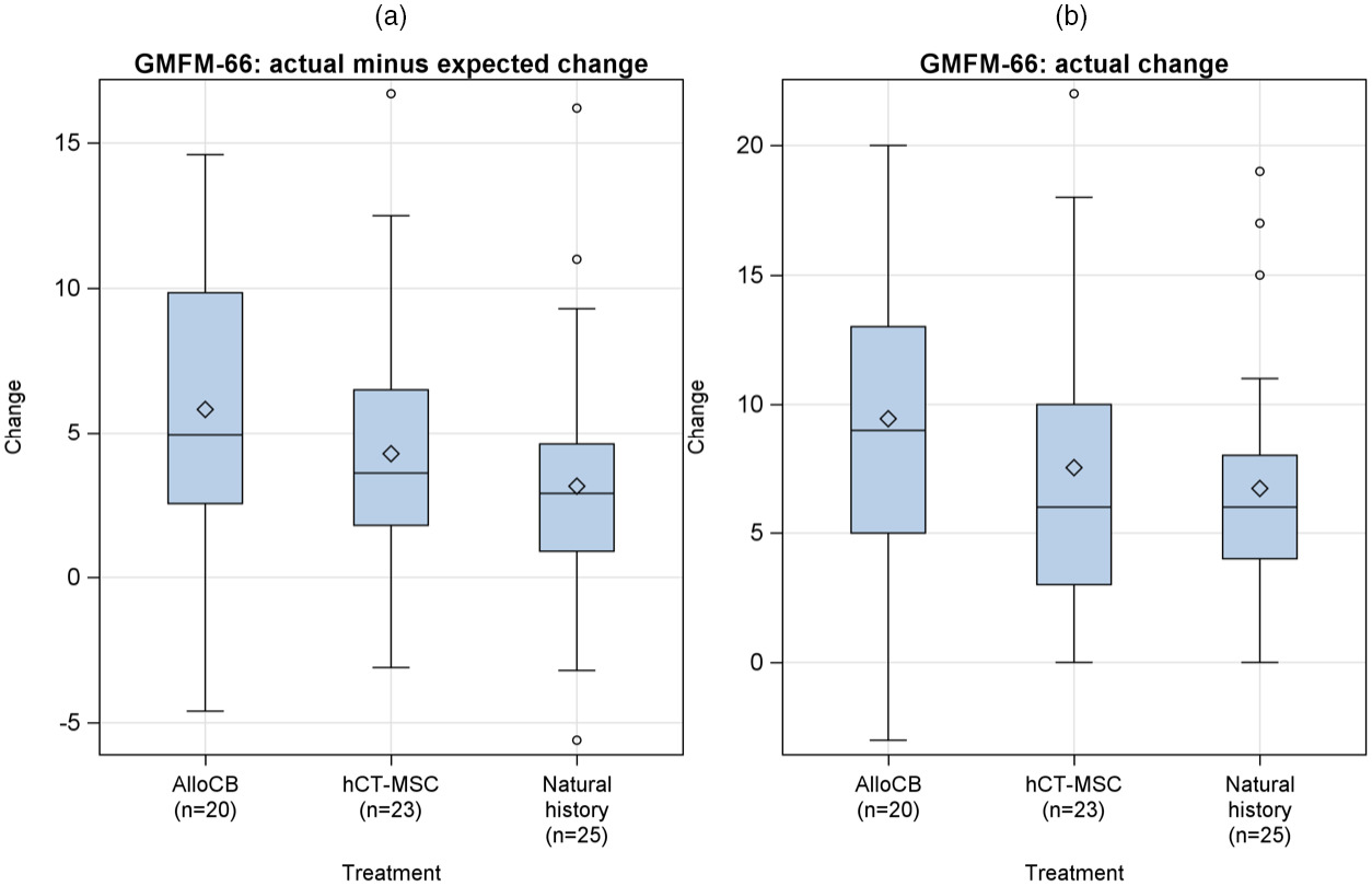 (a) 研究的主要結果是GMFM-66從基線(xiàn)到第12個(gè)月的實(shí)際減去預期變化。平均變化(和95%置信區間)為 5.8 (3.4–8.2)、4.3 (2.2–6.4 ),同種異體臍帶血 (AlloCB)、人臍帶組織來(lái)源的間充質(zhì)基質(zhì)細胞 (hCT-MSC) 和自然歷史臂分別為 3.1 (1.4–5.0)。