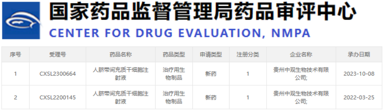 2023年10月8日,貴州中觀(guān)生物技術(shù)有限公司獲得了受理批號CXSL2300664,這是該公司的第二款細胞藥物IND獲受理。早在2022年3月25日,他們的首款“人臍帶間充質(zhì)干細胞注射液”獲得了CDE默示許可,適應癥為膝骨關(guān)節炎的治療。