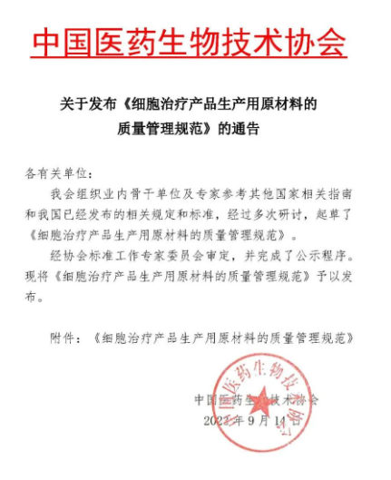 吉林中科生物工程股份有限公司參與制定:《細胞治療產(chǎn)品生產(chǎn)用原材料的質(zhì)量管理規范》