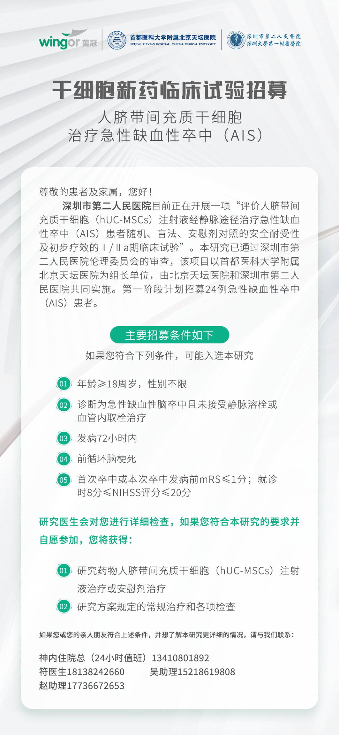 現階段,該公司正與首都醫科大學(xué)附屬北京天壇醫院和深圳市第二人民醫院合作,共同實(shí)施名為“評價(jià)人臍帶間充質(zhì)干細胞治療急性缺血性卒中患者的Ⅰ/Ⅱa期臨床試驗”。該研究已獲深圳市第二人民醫院倫理委員會(huì )批準。
