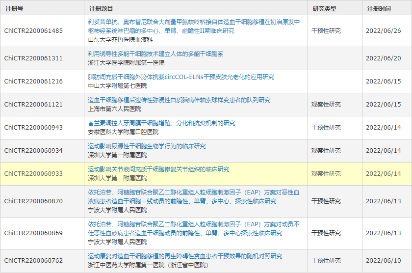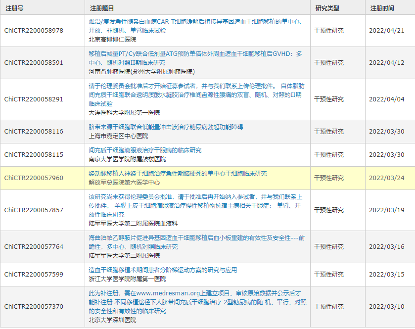 以下是2022年中國干細胞臨床試驗注冊中心,2022年注冊的臨床項目。