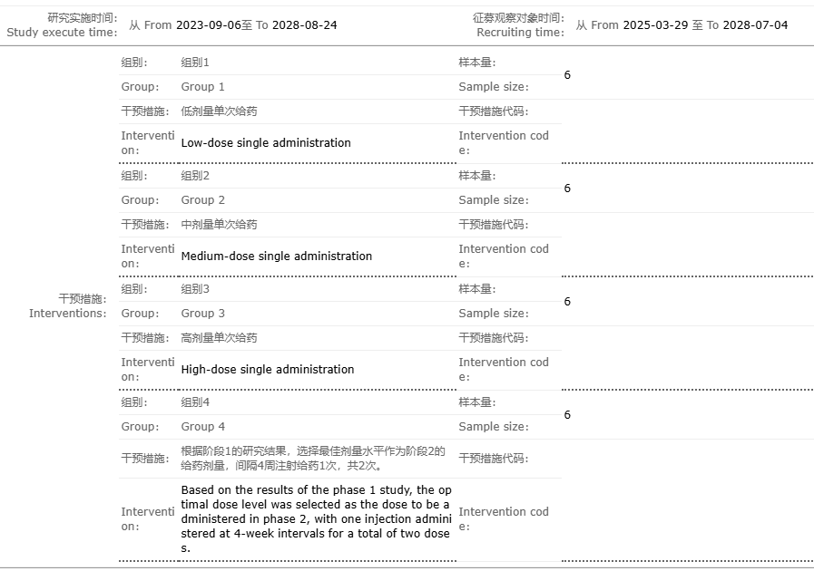 本研究分為兩個(gè)階段,第一階段將設置低、中、高三種劑量單次給藥組,每組各6名受試者;第二階段則將在第一階段基礎上,選取最佳劑量方案,采用間隔4周注射一次,共兩次的給藥方式。