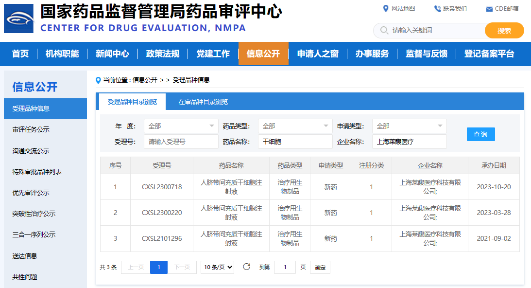 上海代表,上海萊馥醫療科技有限公司,其研發(fā)的人臍帶間充質(zhì)干細胞注射液也在2023年10月20日獲得了批準,批準編號為CXSL2300718。這也是他們第三次獲得IND受理。