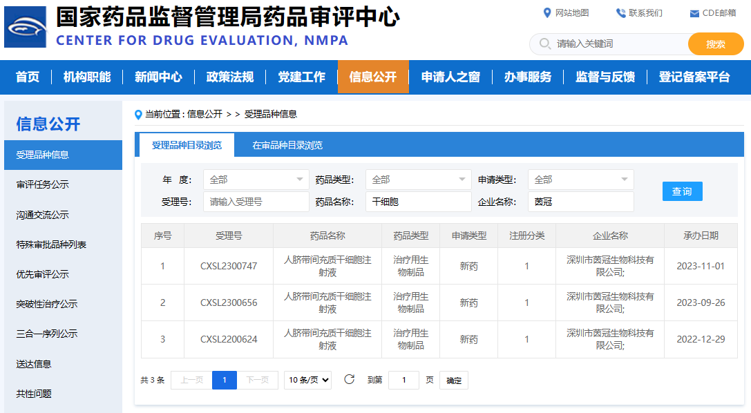 至于深圳,茵冠生物科技有限公司的表現更是令人矚目。短短一個(gè)多月的時(shí)間里,該公司便有兩款干細胞新藥IND相繼獲得國家藥品監督管理局的受理,其中人臍帶間充質(zhì)干細胞注射液于2023年11月1日成功獲得受理(受理編號:CXSL2300747)。這不僅展現了茵冠生物在干細胞新藥研發(fā)領(lǐng)域的強大實(shí)力,也充分體現了其快速反應和創(chuàng )新能力。