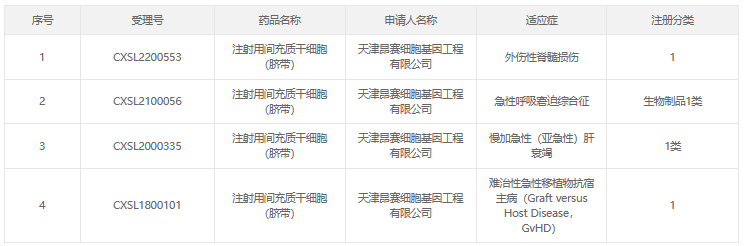 天津昂賽細胞基因工程有限公司成立于2004年,2020年4月獲國家藥監局默示許可,其研發(fā)的異基因臍帶間充質(zhì)干細胞藥物進(jìn)入臨床實(shí)驗階段。截止到2023年1月,公司的干細胞產(chǎn)品已有4個(gè)適應癥獲得國家藥品監督管理局藥品審評中心臨床試驗默示許可。分別為:外傷性脊髓損傷、急性呼吸窘迫綜合征、慢加急性(亞急性)肝衰竭、難治性急性移植物抗宿主病。