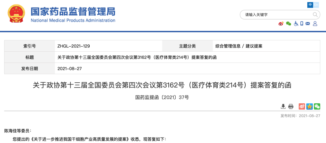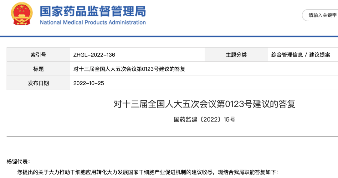 國家藥監局關(guān)于大力推動(dòng)干細胞應用轉化大力發(fā)展國家干細胞產(chǎn)業(yè)促進(jìn)機制的建議答復