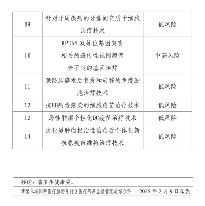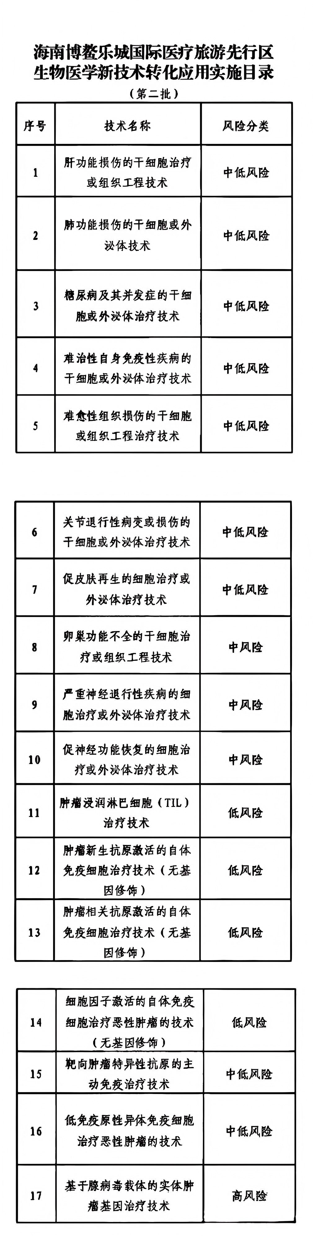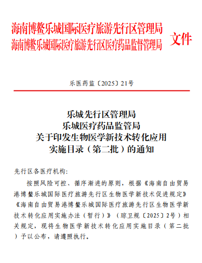 3月10日,海南博鰲樂(lè )城國際醫療旅游先行區管理局與醫療藥品監督管理局聯(lián)合發(fā)布《生物醫學(xué)新技術(shù)轉化應用實(shí)施目錄(第二批)》。