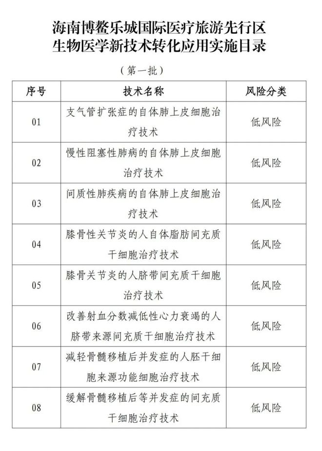 此前,海南博鰲樂(lè )城國際醫療旅游先行區管理局與醫療藥品監督管理局聯(lián)合發(fā)布的《生物醫學(xué)新技術(shù)轉化應用實(shí)施目錄(第一批)》如下: