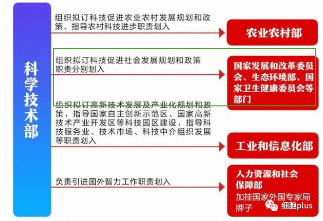 將科學(xué)技術(shù)部的組織擬訂科技促進(jìn)農業(yè)農村發(fā)展規劃和政策、指導農村科技進(jìn)步職責劃入農業(yè)農村部。將科學(xué)技術(shù)部的組織擬訂科技促進(jìn)社會(huì )發(fā)展規劃和政策職責分別劃入國家發(fā)展和改革委員會(huì )、生態(tài)環(huán)境部、國家衛生健康委員會(huì )等部門(mén)。將科學(xué)技術(shù)部的組織擬訂高新技術(shù)發(fā)展及產(chǎn)業(yè)化規劃和政策,指導國家自主創(chuàng )新示范區、國家高新技術(shù)產(chǎn)業(yè)開(kāi)發(fā)區等科技園區建設,指導科技服務(wù)業(yè)、技術(shù)市場(chǎng)、科技中介組織發(fā)展等職責劃入工業(yè)和信息化部。將科學(xué)技術(shù)部的負責引進(jìn)國外智力工作職責劃入人力資源和社會(huì )保障部,在人力資源和社會(huì )保障部加掛國家外國專(zhuān)家局牌子。